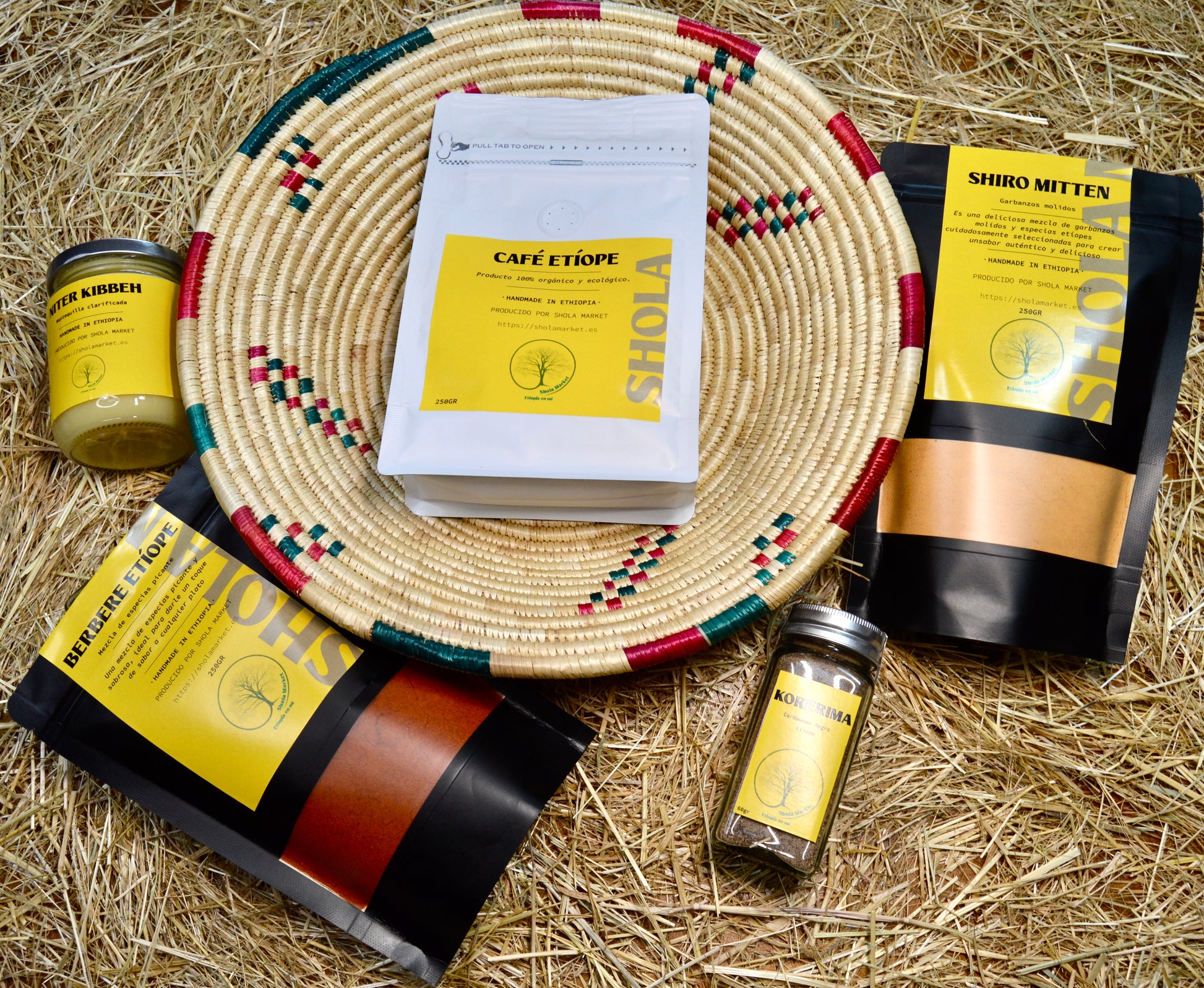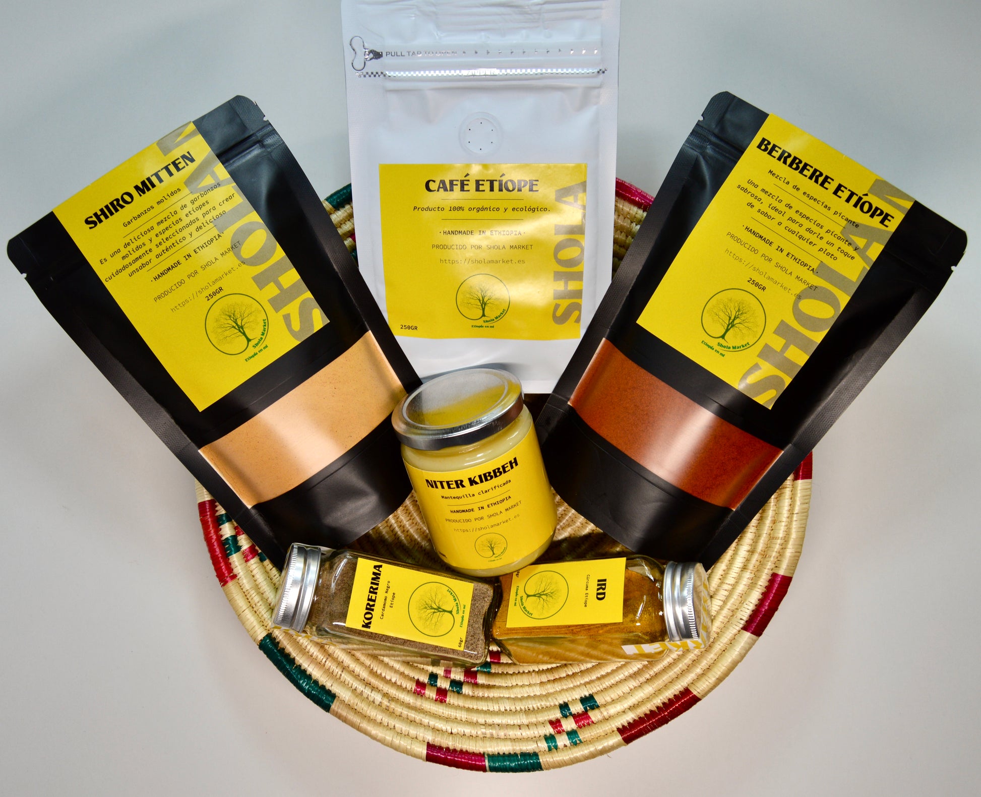 Sumérgete en los sabores esenciales de Etiopía con este pack único. El Pack Esencia de Abisinia incluye café, Shiro, Berbere, Kibbeh y Korerima, cuidadosamente seleccionados y presentados en una cesta etíope hecha a mano. Este es un regalo auténtico que te lleva directo al corazón de la cocina etíope.